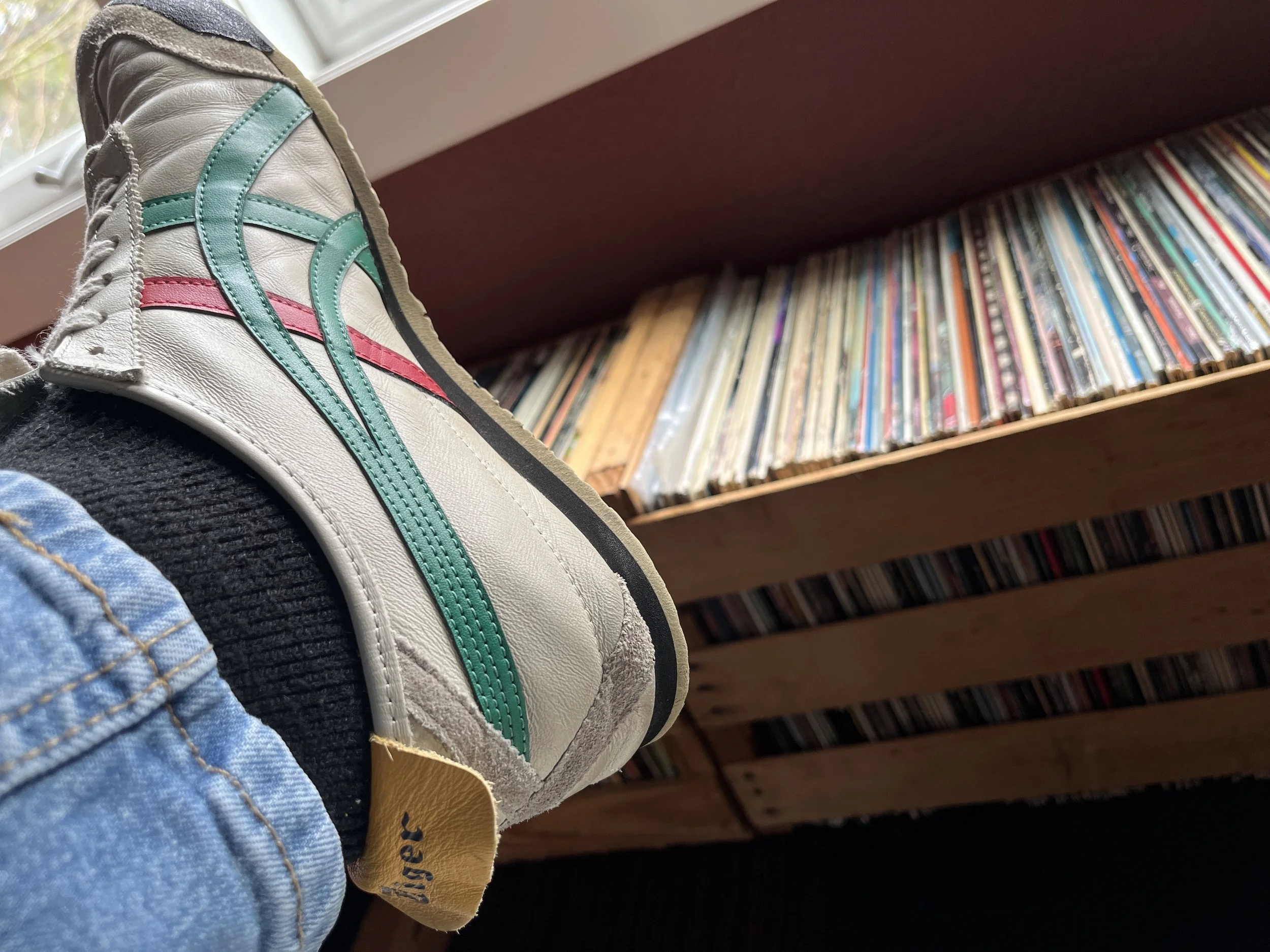 Onitsuka Tiger Asics, boxes and boxes of mint first pressing LPs.