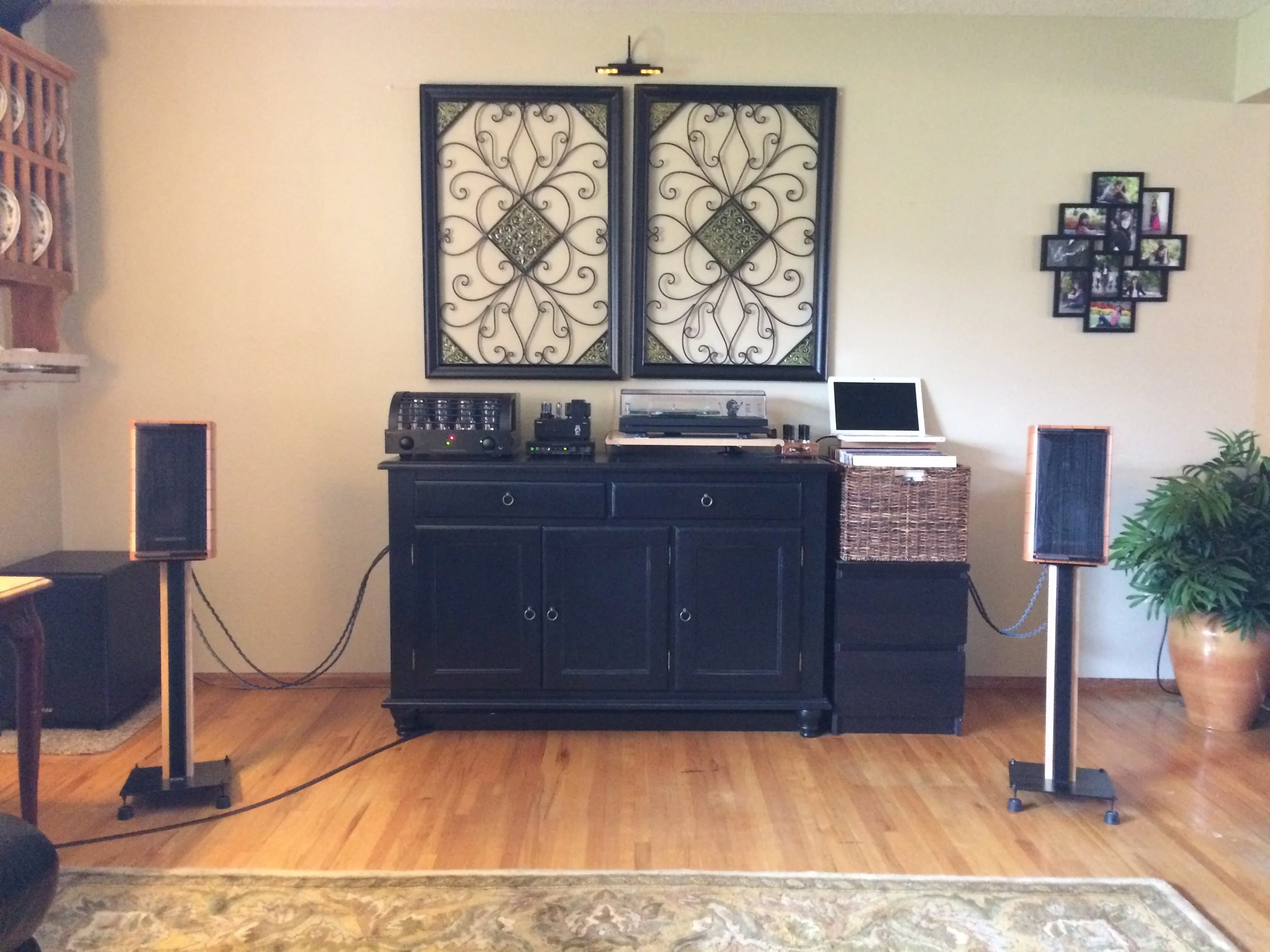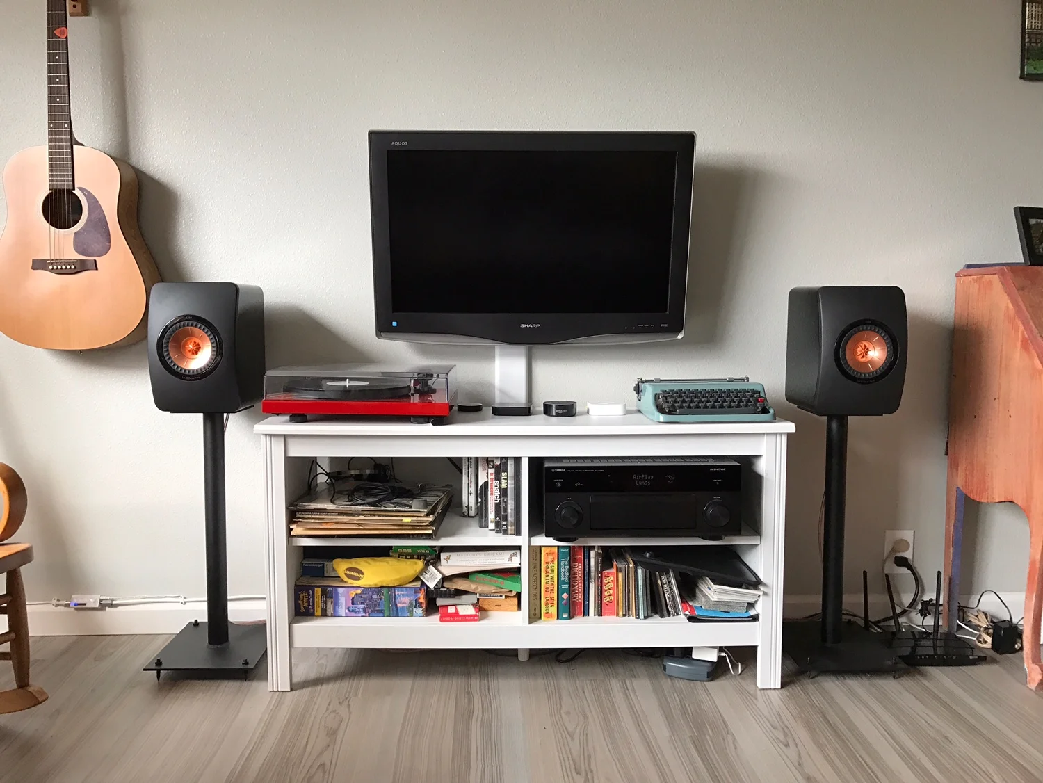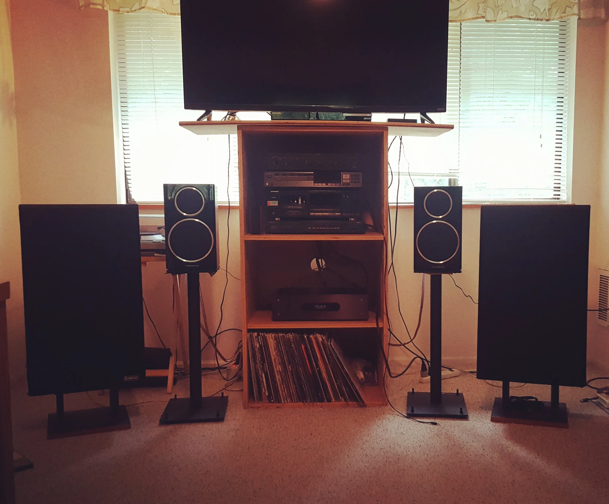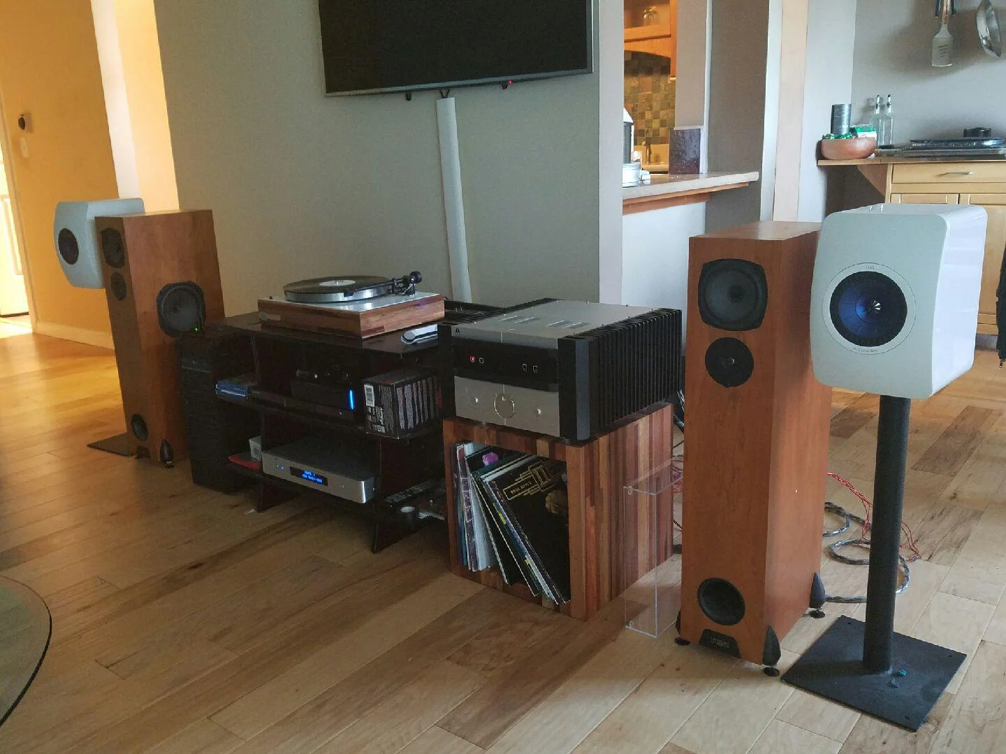 Kailin System: Yamaha AV receiver, ProJect Debut Carbon turntable/Ortofon Red, KEF LS50 speakers, GHA custom speaker stands.