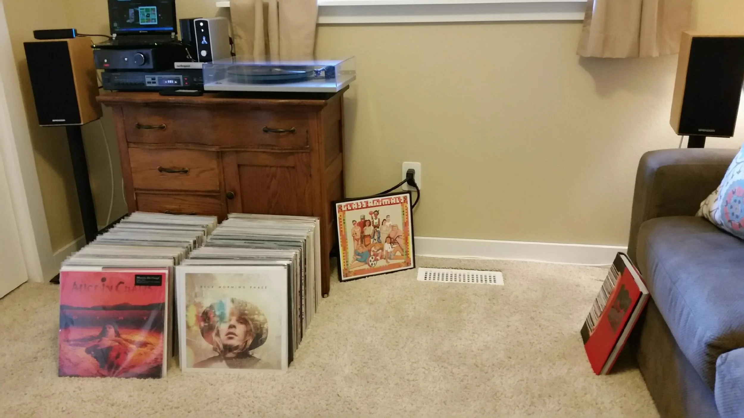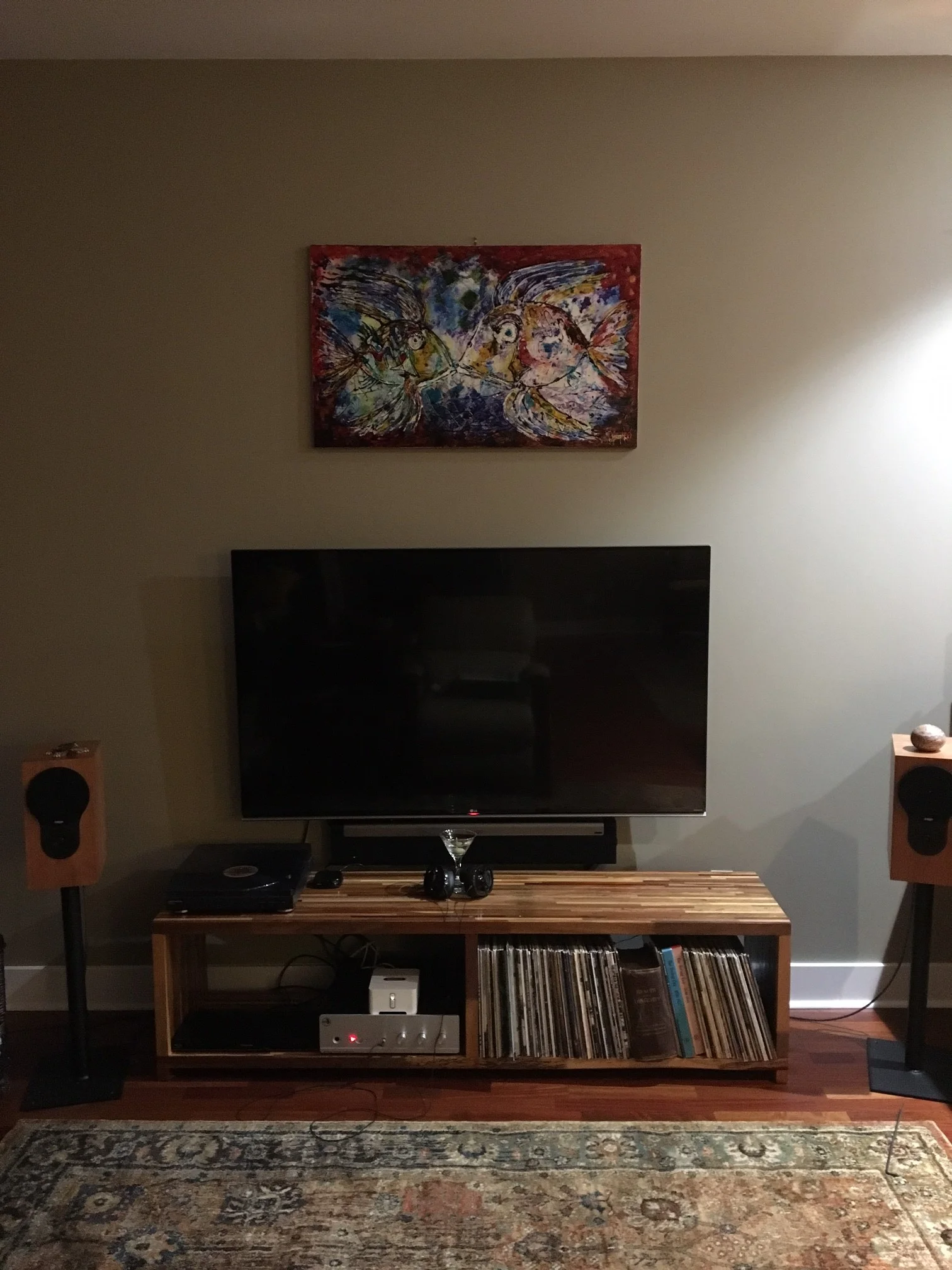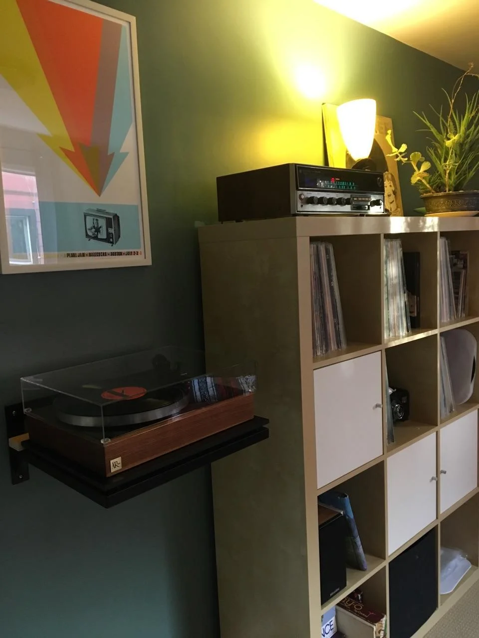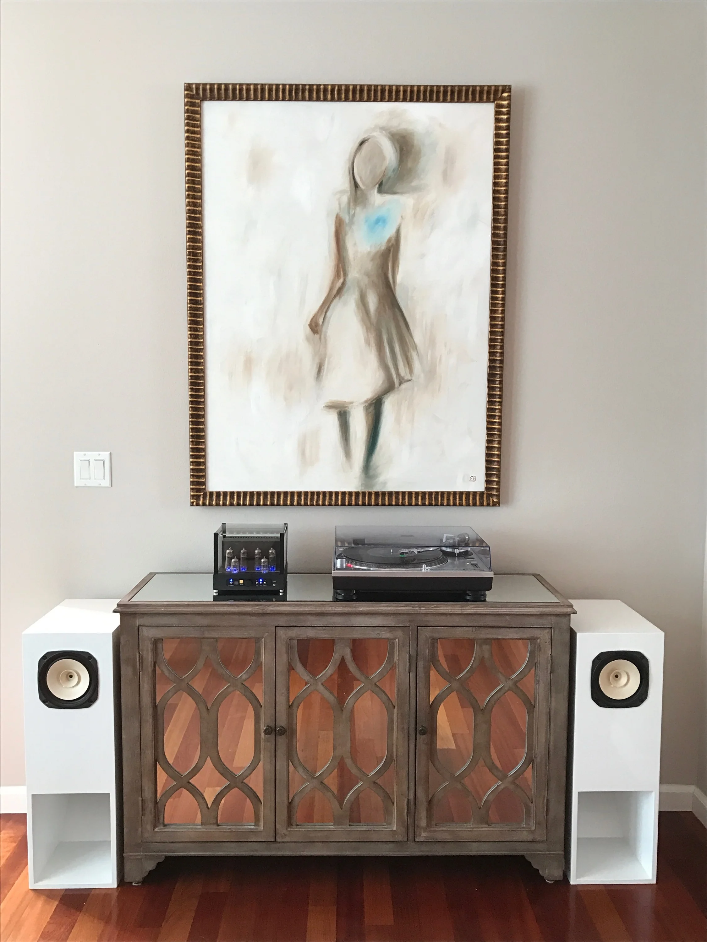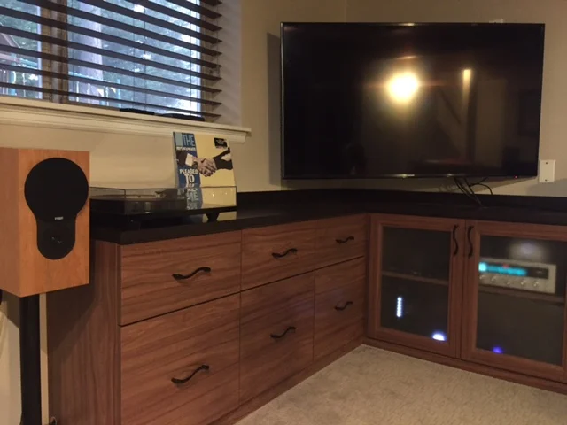 Kailin System: Yamaha AV receiver, ProJect Debut Carbon turntable/Ortofon Red, KEF LS50 speakers, GHA custom speaker stands.