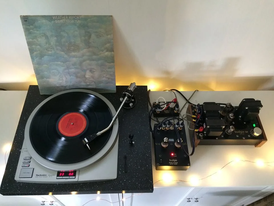 Parks Audio Lab System: Technics SP-15 turntable with Audio-Technica ATP-12 tonearm & Ortofon MC100 moving coil cart, Budgie SE tube amp (3 watts with EL84s), and a Budgie phono preamp with CM1254 step up transformers. Not shown are the DIY bass reflex two-way speakers using repurposed Infinity SM82 cabs and Dayton drivers.