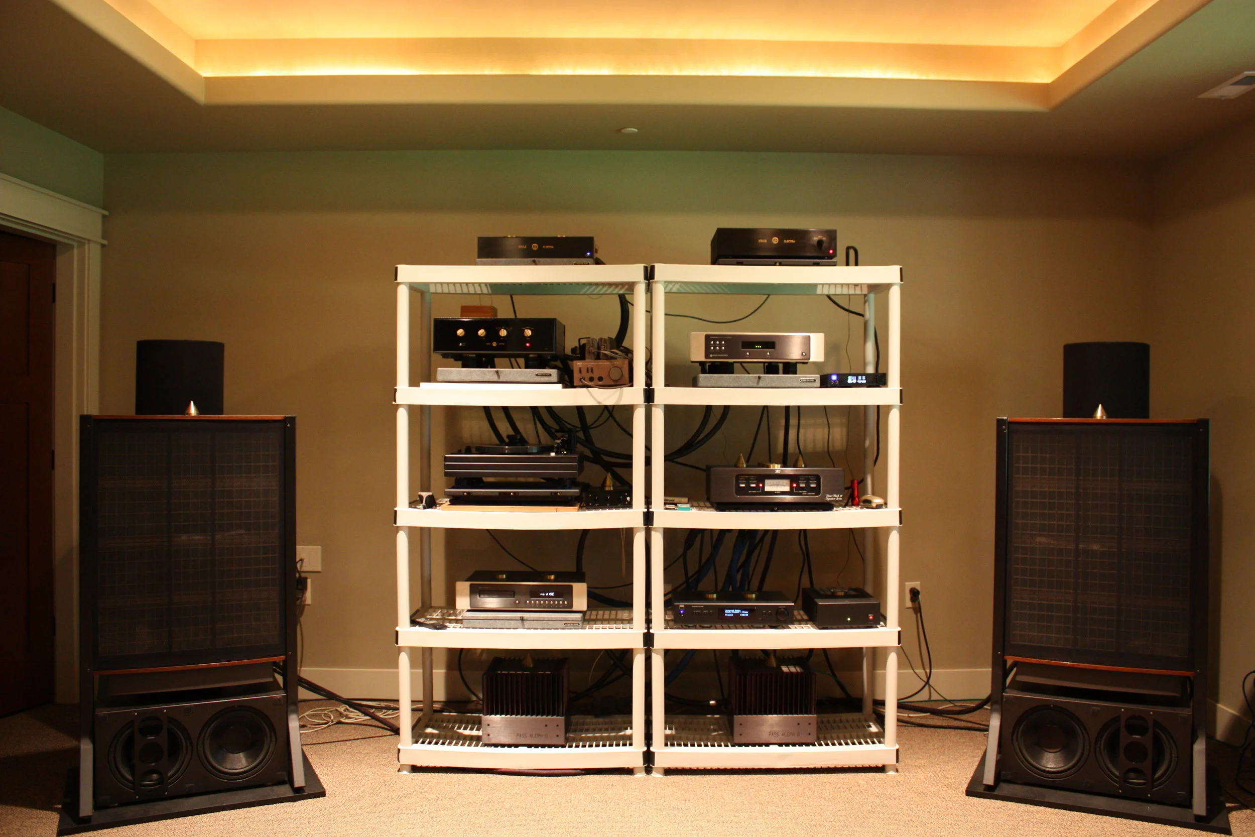 Dr. Jay's Music Room System: Joule Electra LA-150 MK-I Preamp, Joule Electra OPS-1 MK-III Phono Line Stage, Joule Electra Phono Stage Power Supply, Sonic Frontiers, SFT1 Transport with I2S, Sonic Frontiers Processor 3 DAC, Sonic Frontiers Power Supply, Well-Tempered Turntable with Transparent Audio upgrades, Van den Hul Frog phono cartridge with Hovland Music Groove cartridge cable, Nelson Pass Aleph 0 monoblock amps x 2, Mytek Brooklyn DAC, NAD C446 Digital Media Tuner, Stax Signature Lamba Pro Headphones, Quad ESL-63 Electrostatic speakers on Arcici stands, Electrostatic Bass Traps, Entec L2-F20 Subwoofers, Tice Signature III Power Block conditioner, Cables: Aural Symphonics interconnects and power cords, 100 Amp dedicated service panel. HOLY COW.