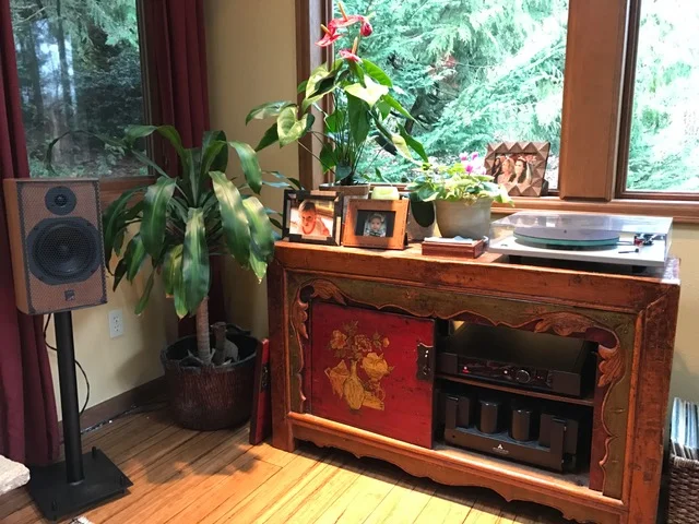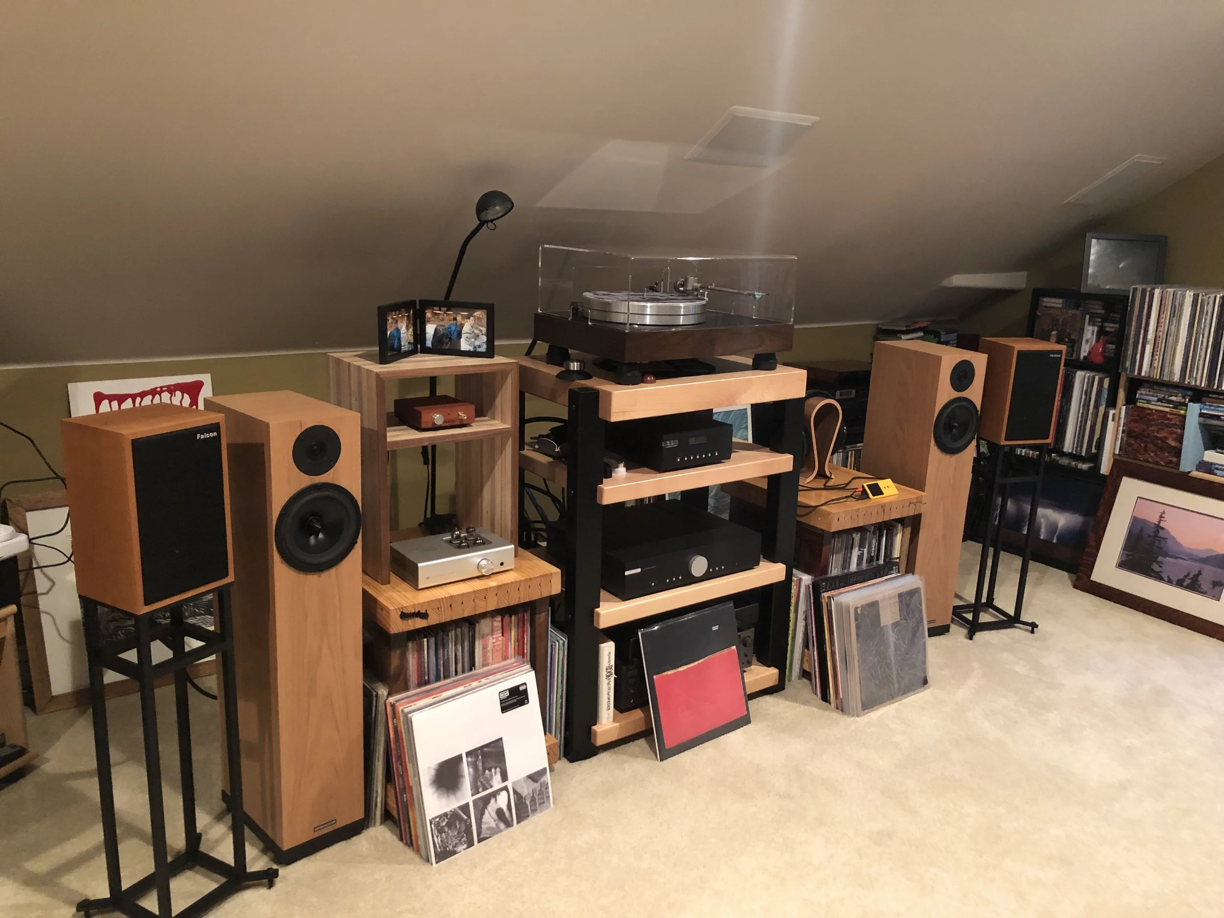 Adam S system: Spendor A7s, Falcon LS3/5a, GHA 24” stands, GHA custom wood LP holders, VPI turntable, AMG Teatro LOMC cartridge, Musical Fidelity phono stage, Musical Fidelity integrated amp,