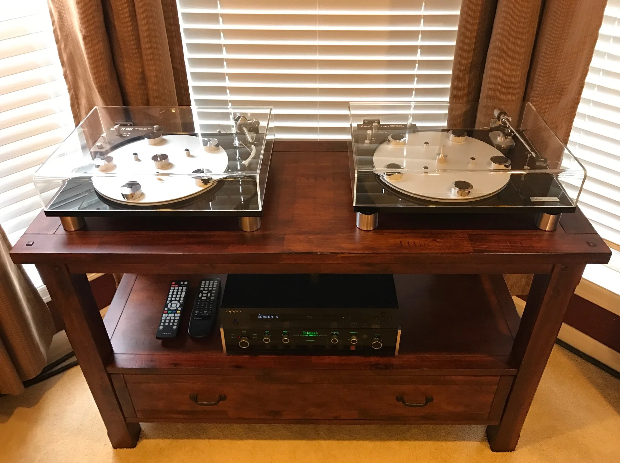 Troy J System: Left Audio Linear turntable: SME Type II Improved-R VDH MCD-501, Grado G2+. Right Audio Linear turntable: Grace 707 w/NOS DIN cable, 1/4" glass platter, Grado Prestige Gold cartridge. Playing with: McIntosh 712, Oppo 103, McIntosh MC7200, Monster Signature HTPS 7000, Shunyata Antares (Bal) IC, MIT 3 Bi-wired, and Vandersteen 2CI speakers. Wow.