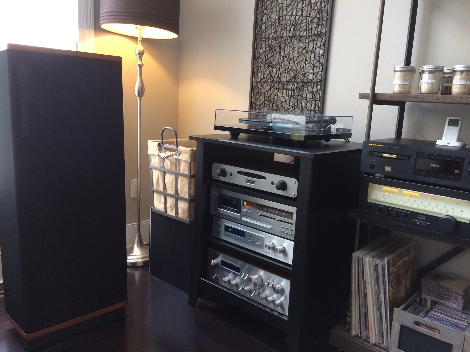 Delmas B System LSA integrated (GHA custom LP box), GHA custom AR-XA/Ortofon Blue, Rega RS5 speakers, KEF LS50 speakers (GHA 24 stands)
