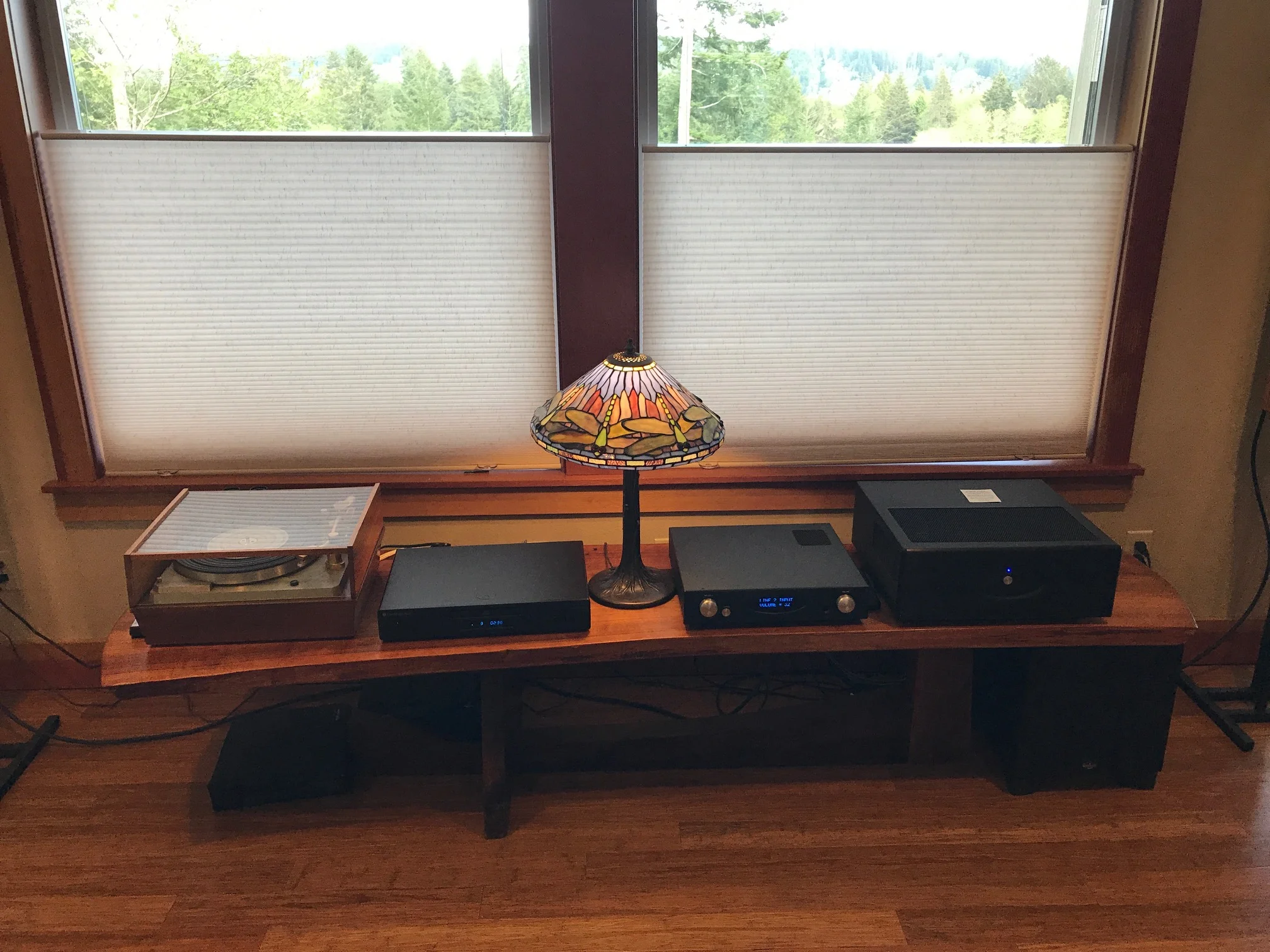 Brian F system (!): Accuphase DP-430 CD player, Accuphase E-270 integrated amplifier, Accuphase AD-50 MM/MC phono board, VPI Aries Scout turntable, VPI JMW-9 tonearm, Hana SL phono cartridge, Dynaudio Special 40 loudspeakers, Dynaudio Stand 6 speaker stands, Luna Red speaker cables, Luna Orange AC cable, Mapleshade Ultra Minimalist AC outlet, Box Furniture Co. S4S hi-fi rack. Behind rack: Luna Red RCA cables tonearm-to-amp, Luna Red XLR cables CD player-to-amp, Furutech e-TP66 Rhodium AC power distributor, Luna Mauve AC cables from distributor to amp & CD player, Volex AC cable from distributor to turntable motor