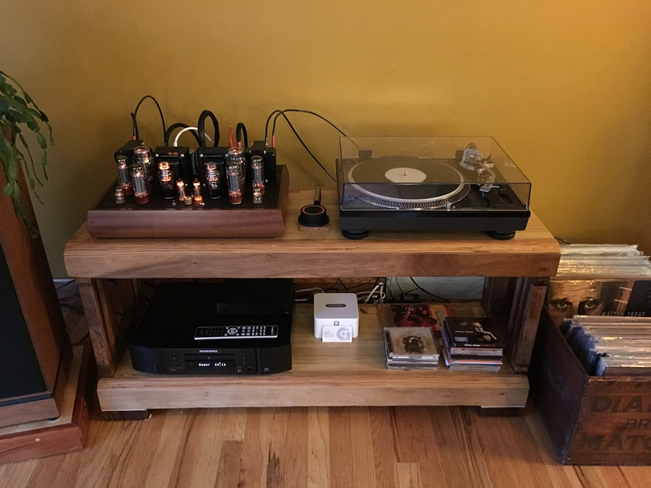 Eric system: Decware Torii MKIV (25 wpc. EL34 tubes), AT 120/Ortofon Blue, Marantz CD, SonosConnect, Klipsch speakers, custom GHA wood table! Wow, that is a nice amp.