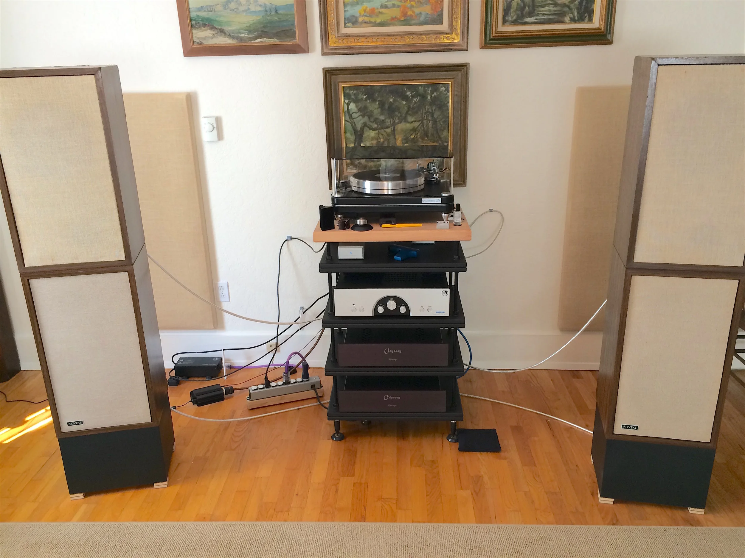 Chuck L System: VPI Scoutmaster II with rebuilt Madrigal Carnegie One and Phoenix Eagle PSU. Clearaudio Basic Plus phono stage. Rogue Audio 99 preamp with super magnum upgrade. Twin Odyssey Audio Khartago stereo power amps, one for each set of speakers. Double Large Advents, refoamed and with new crossover caps and resistors. (One pair were my brothers' college dorm room speakers back in the mid-'70s.) Acoustic Zen Matrix Reference interconnects; Chord Company Carnival Silver Screen speaker cables. Radical!